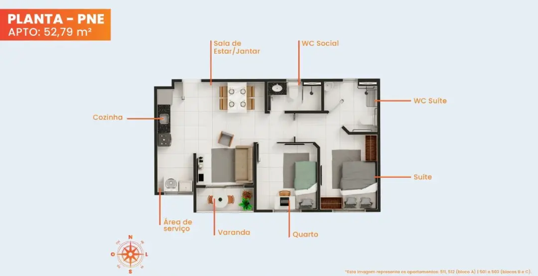 Plantas: Opções de 51,23 m², 52,76 m² e unidades PNE de 52,79 m².