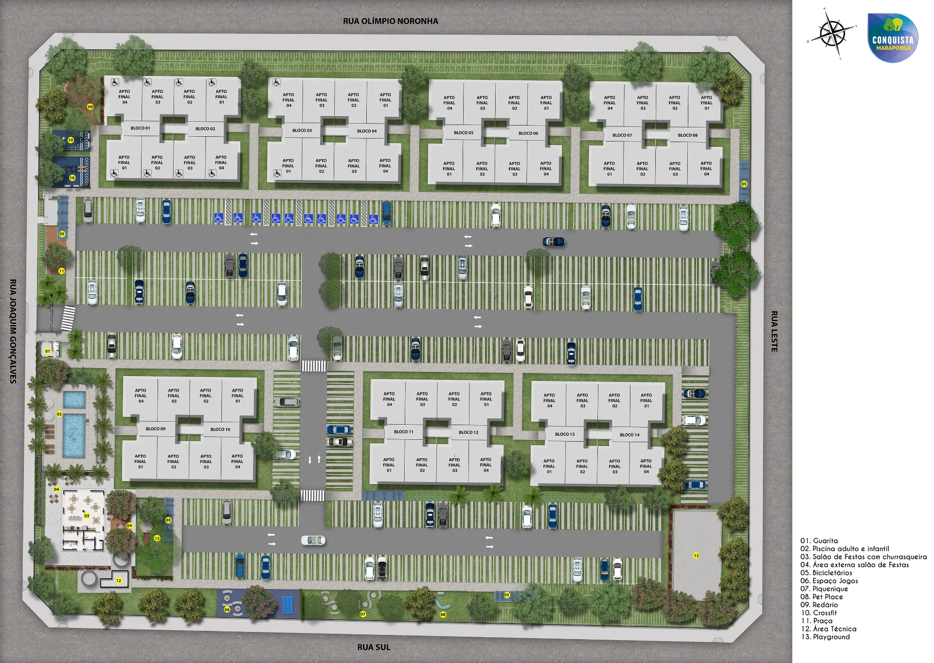 Empreendimento com 280 unidades, distribuídos em 14 blocos; 14 blocos com 4 unidades por andar; 10 unidades PCD;