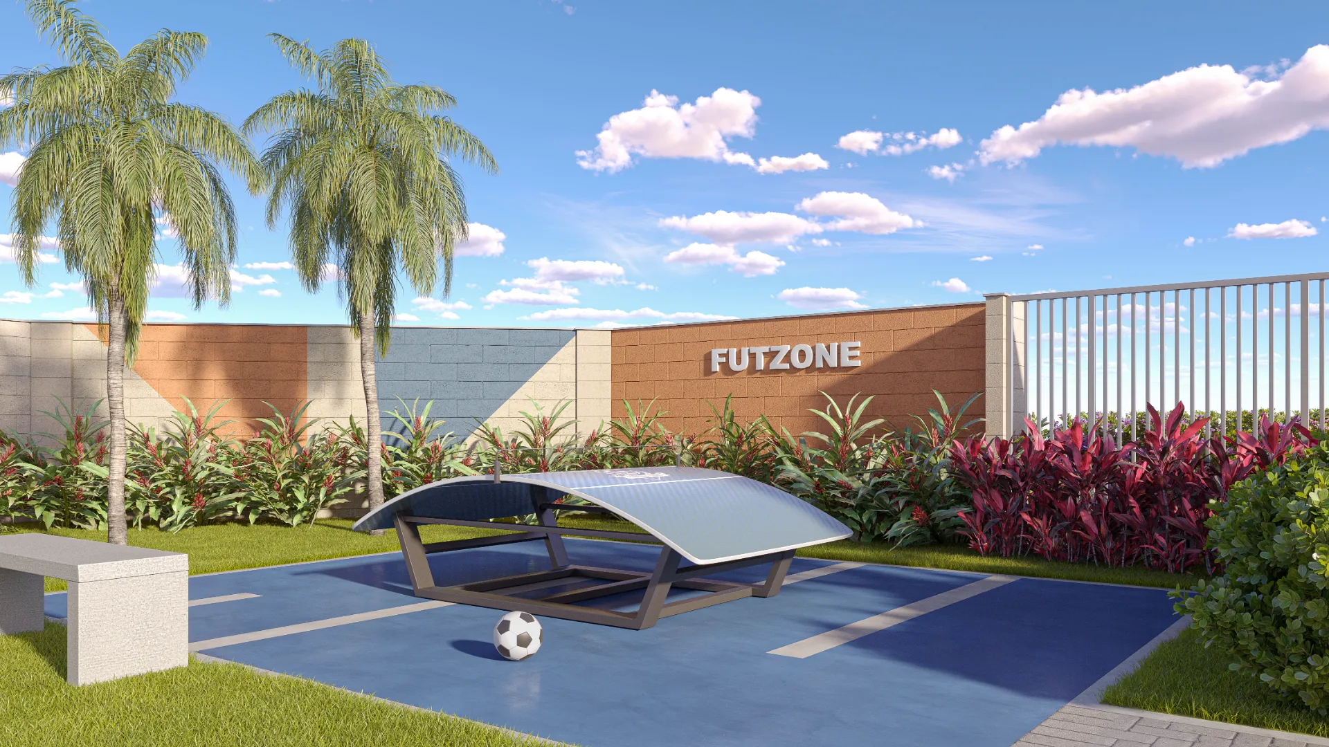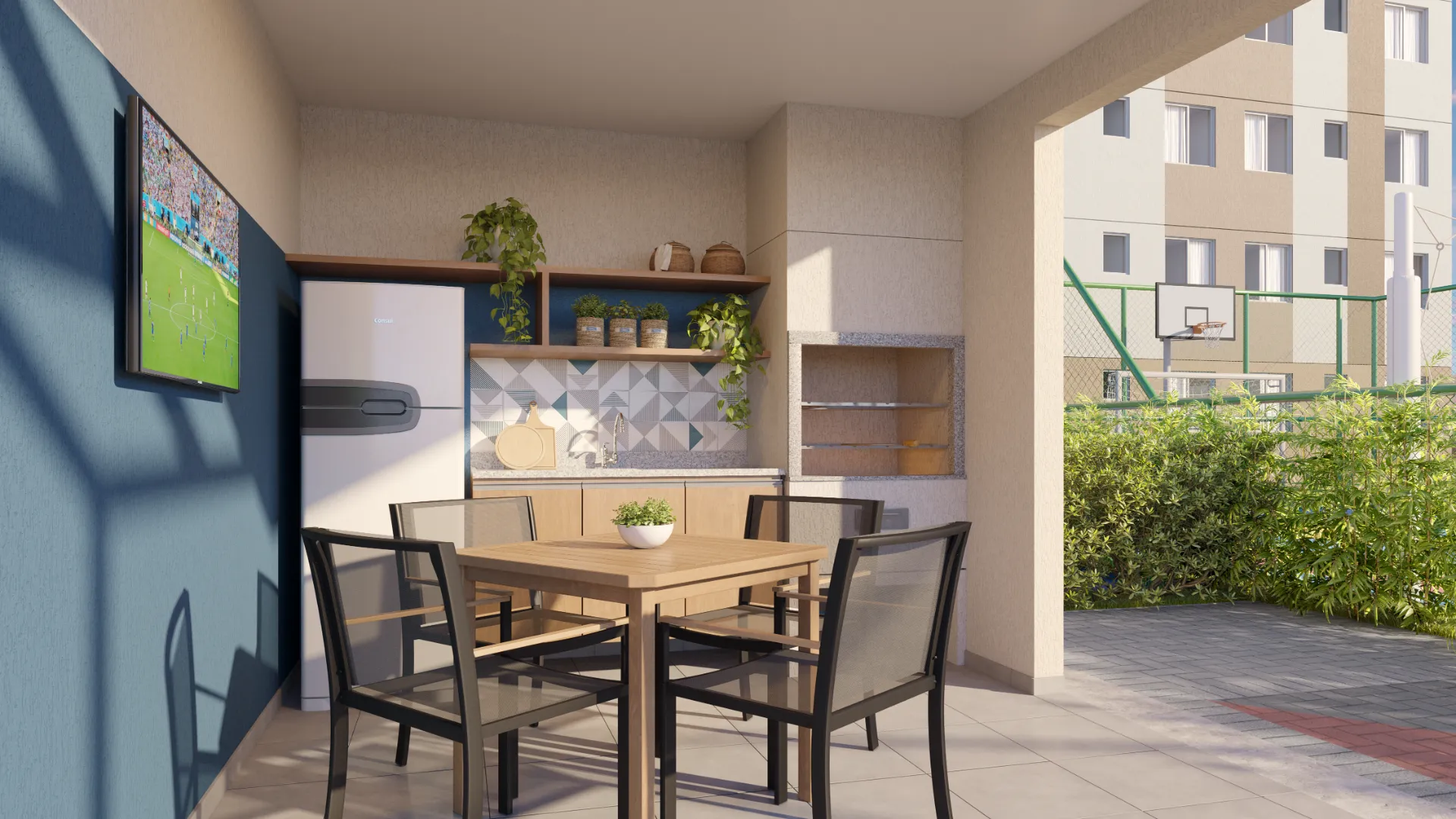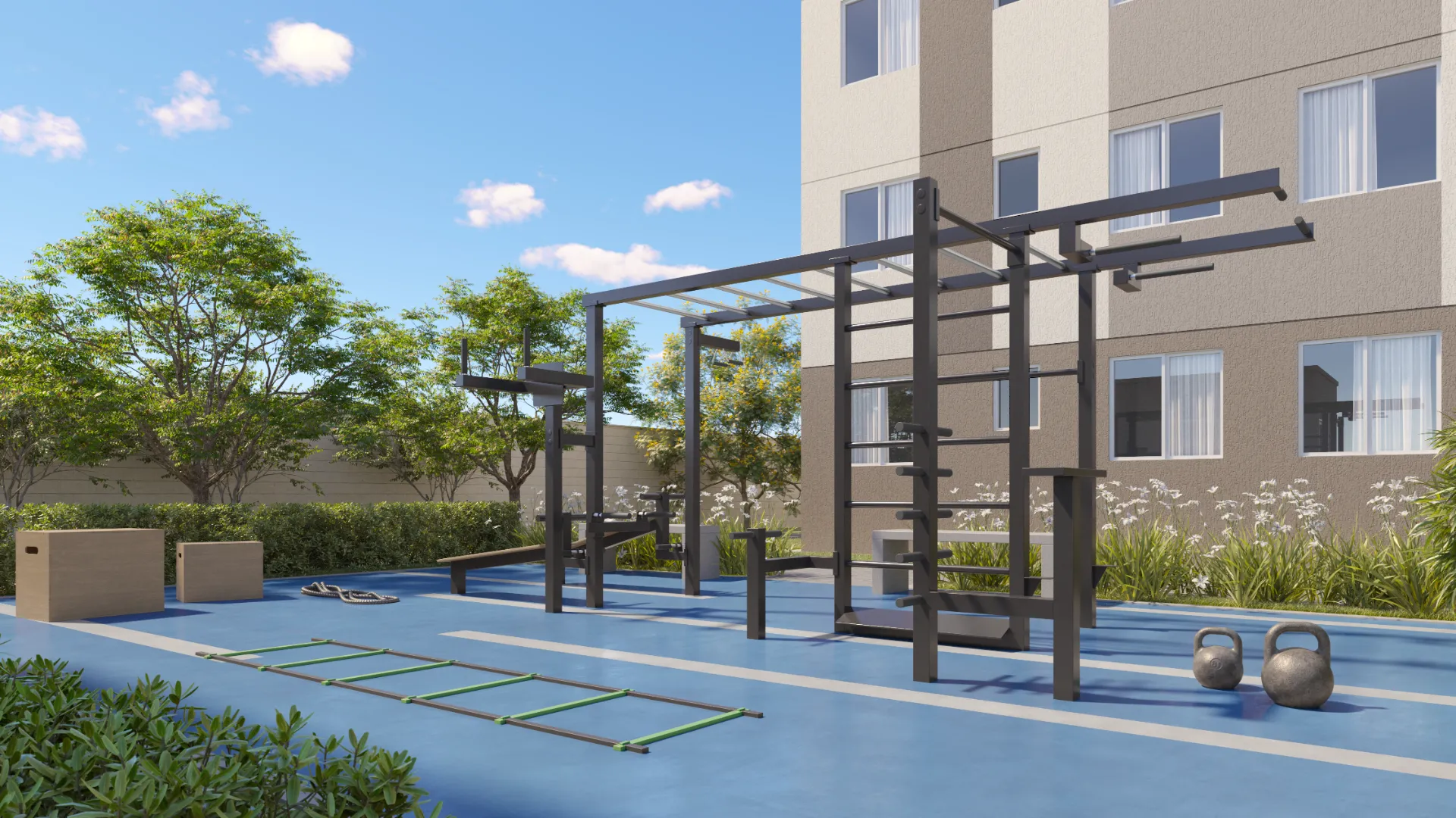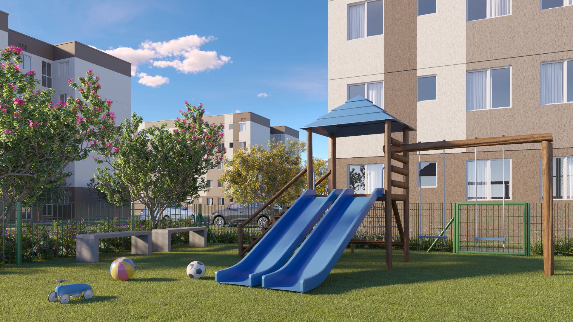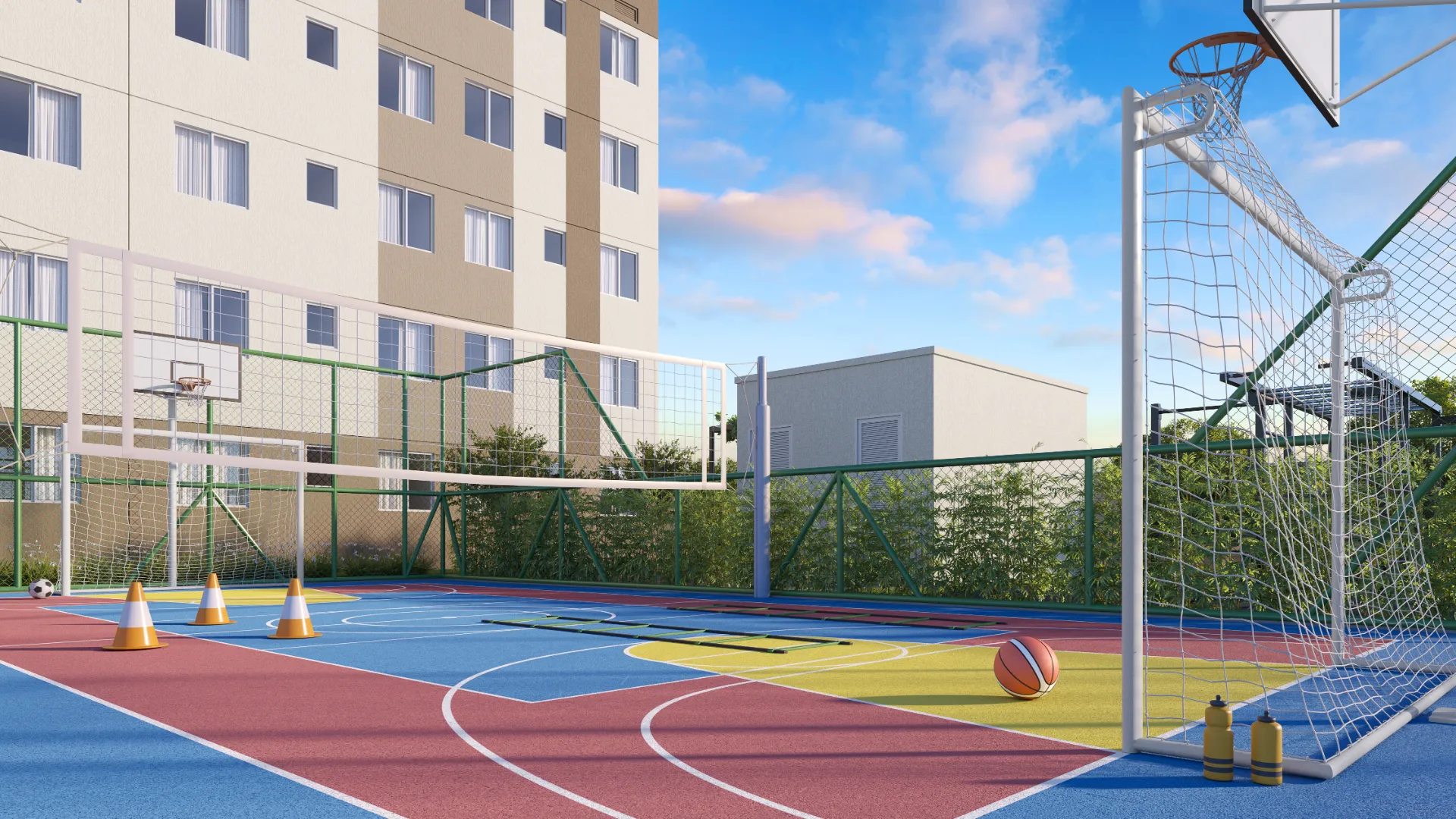 Lazer Ativo: Piscina adulto e infantil, quadra poliesportiva, futzone e academia ao ar livre.