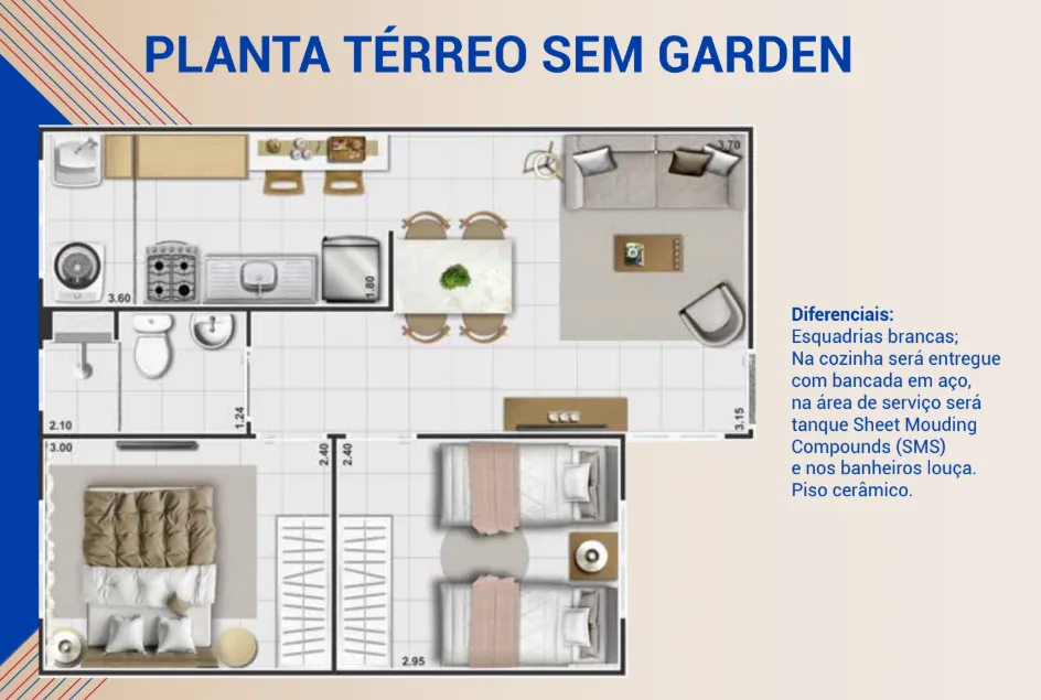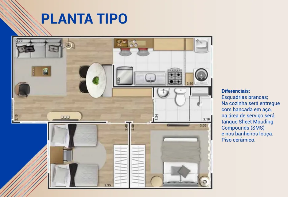 Planta Padrão: 40,67 m² com 2 quartos bem distribuídos, sala de estar/jantar integrada e cozinha funcional.
