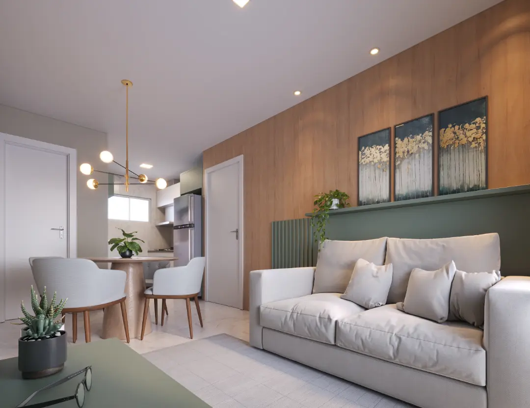 Sala de estar e jantar integradas.
