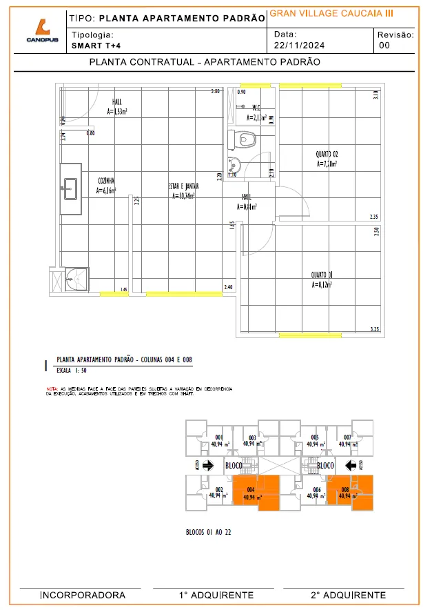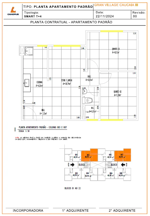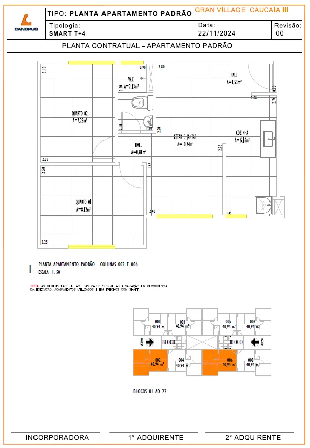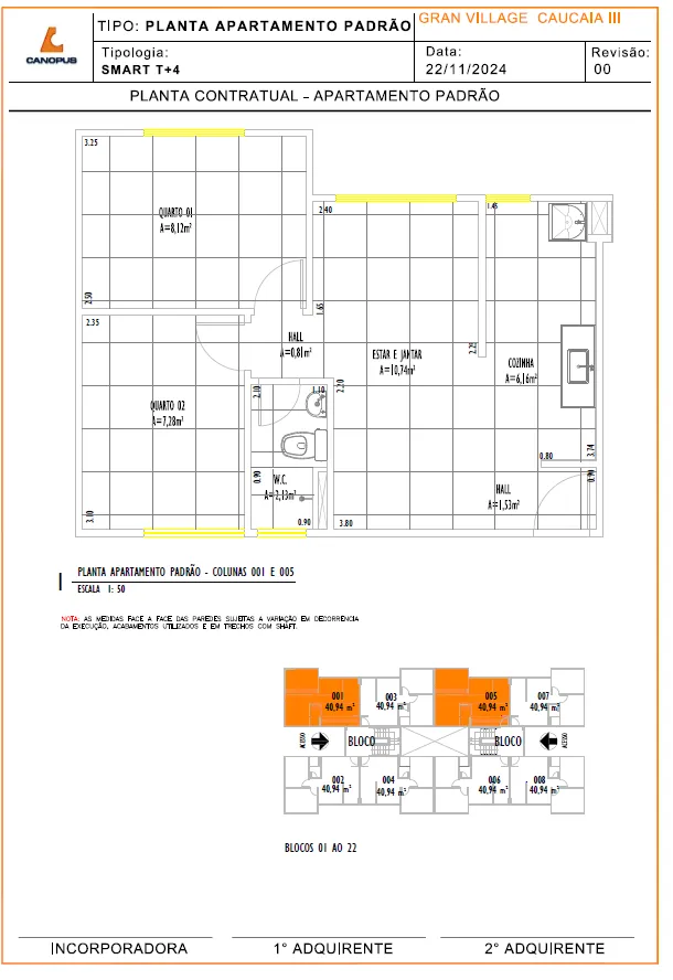 Descrição da Unidade Padrão – Área Privativa: 40,94m2