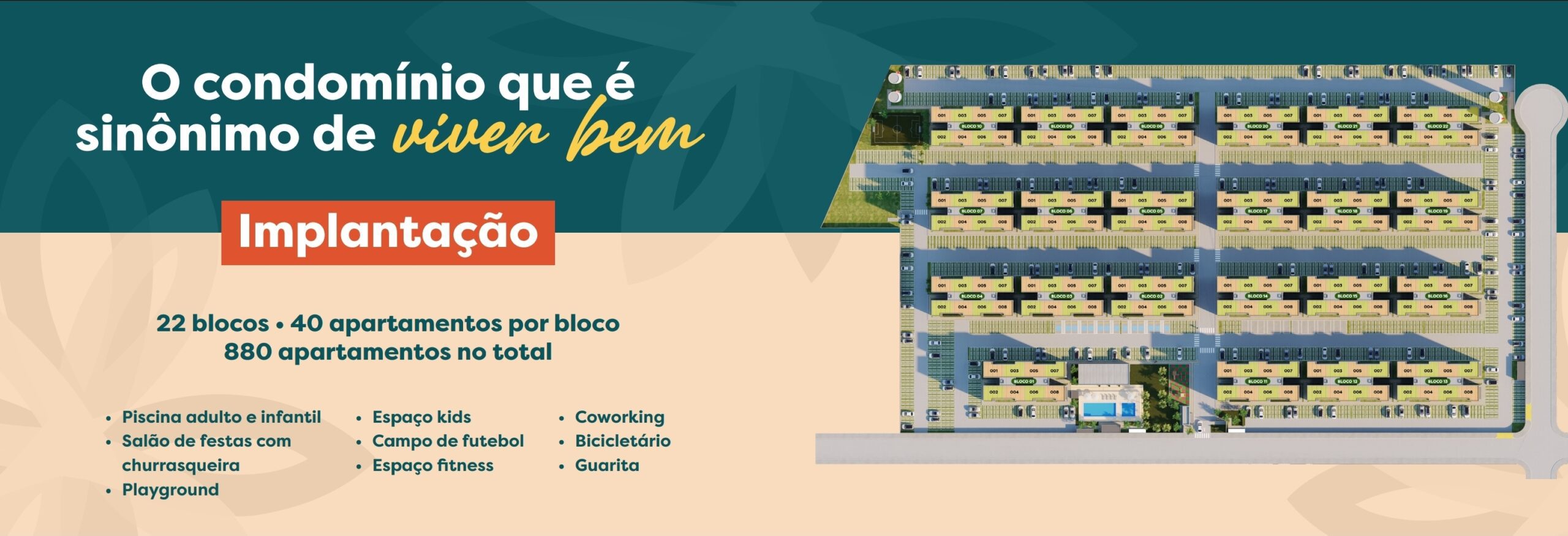 Serão construídos 22 blocos com 40 apartamentos, totalizando 880 (oitocentos e oitenta) unidades habitacionais.