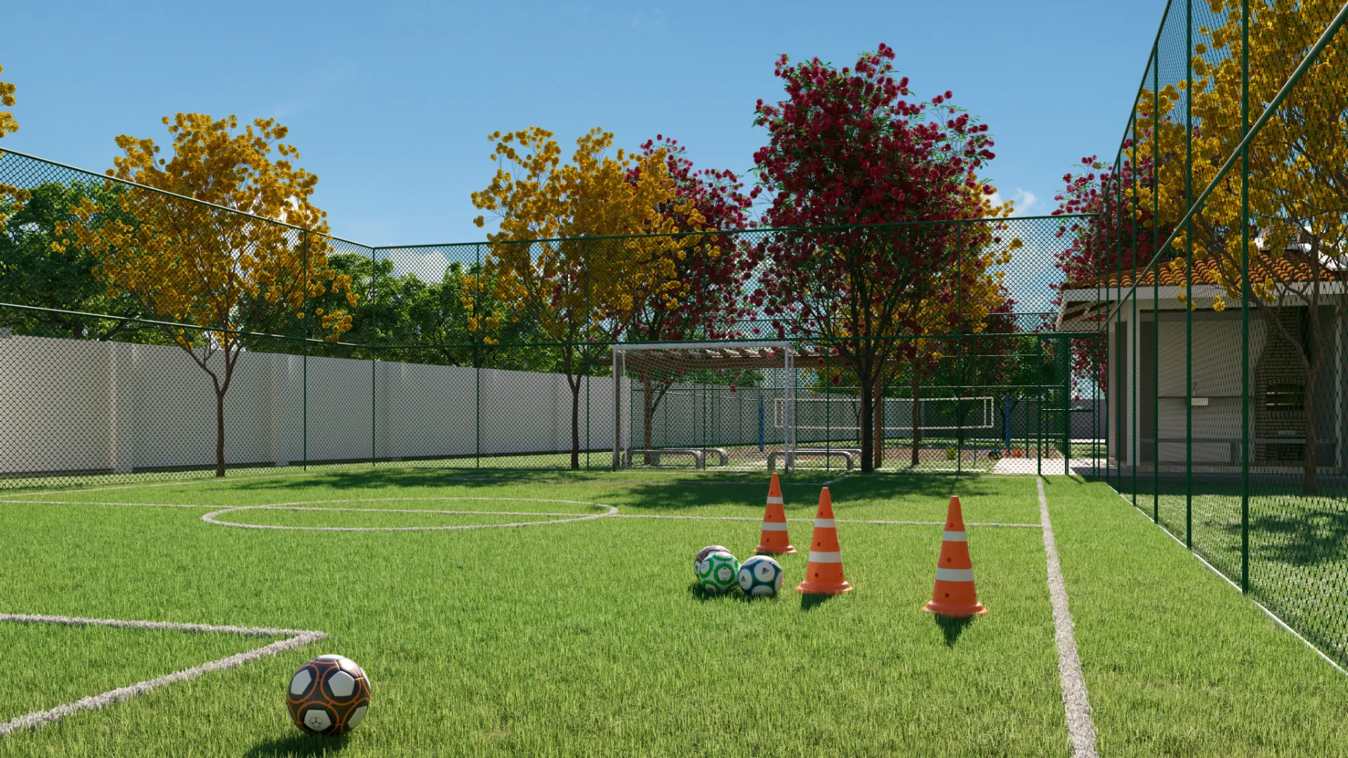 Esportes e Saúde: Quadra de Beach Tennis (tendência moderna), campo de futebol gramado e pista de cooper.