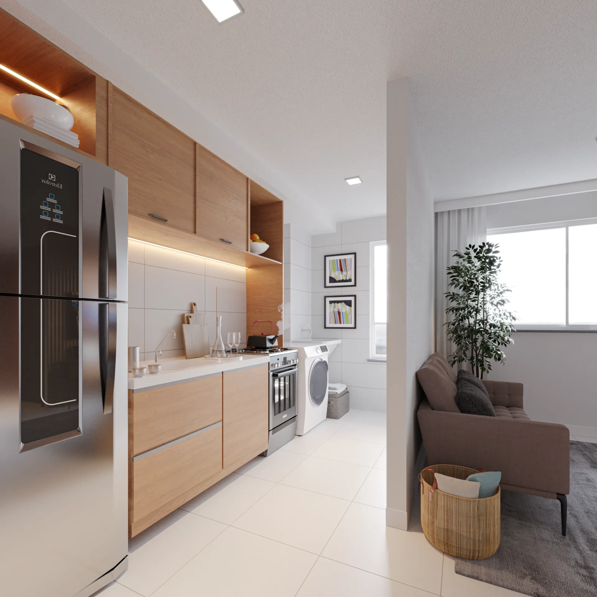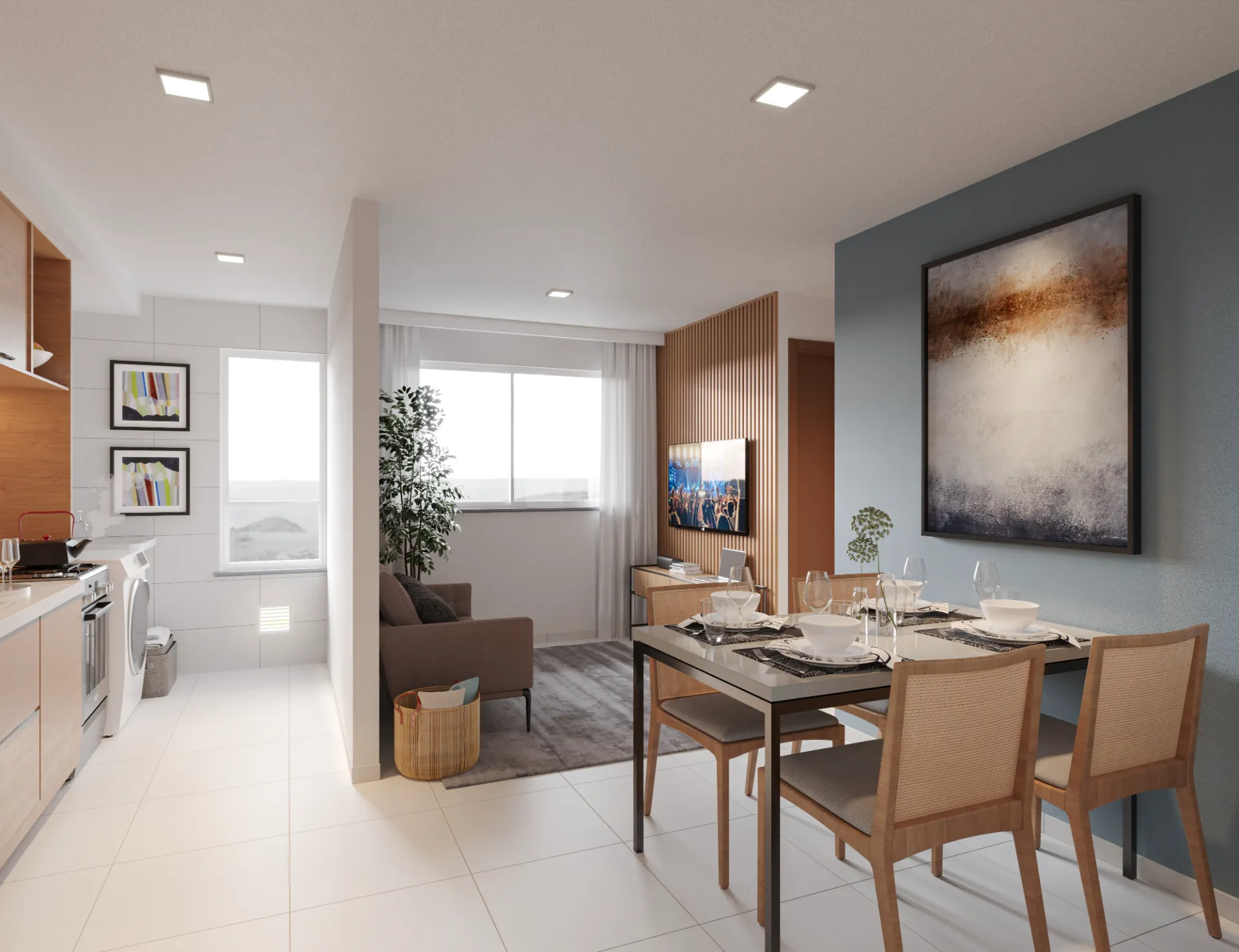 Ambientes Integrados: Sala de estar e jantar conectadas à cozinha americana, otimizando o convívio social.
