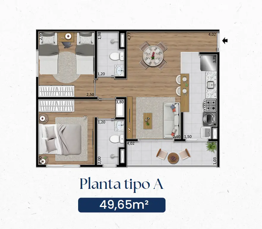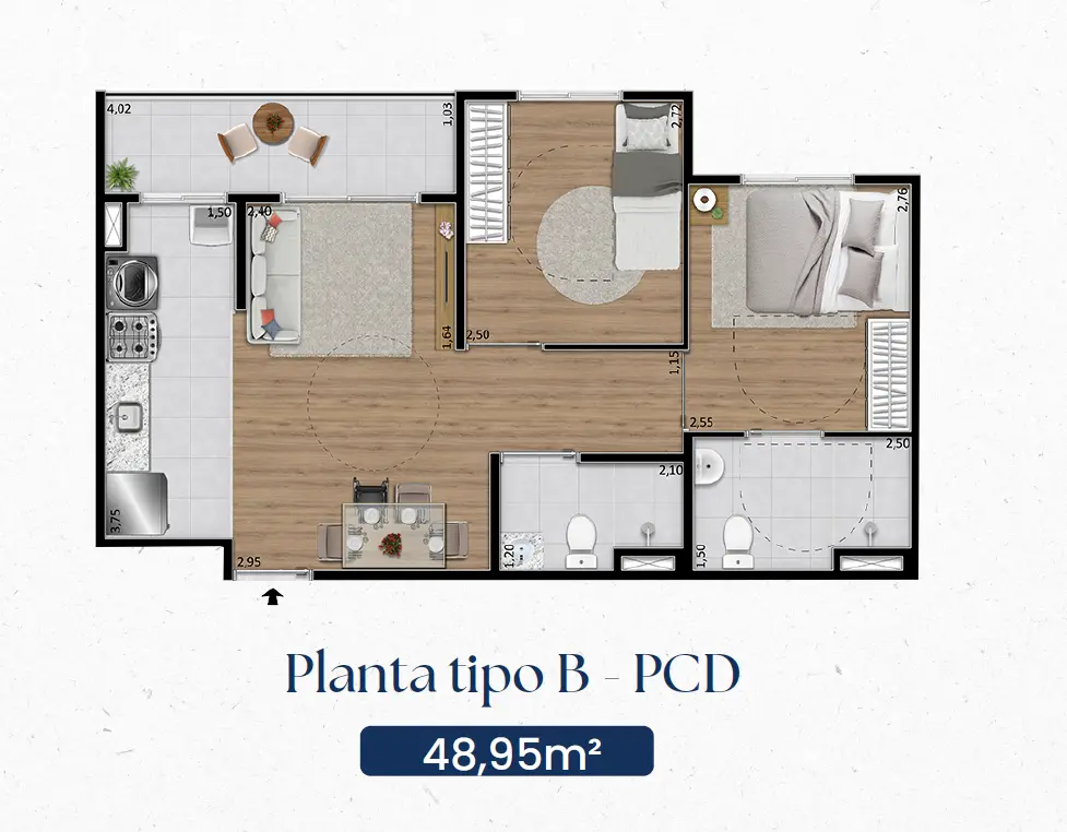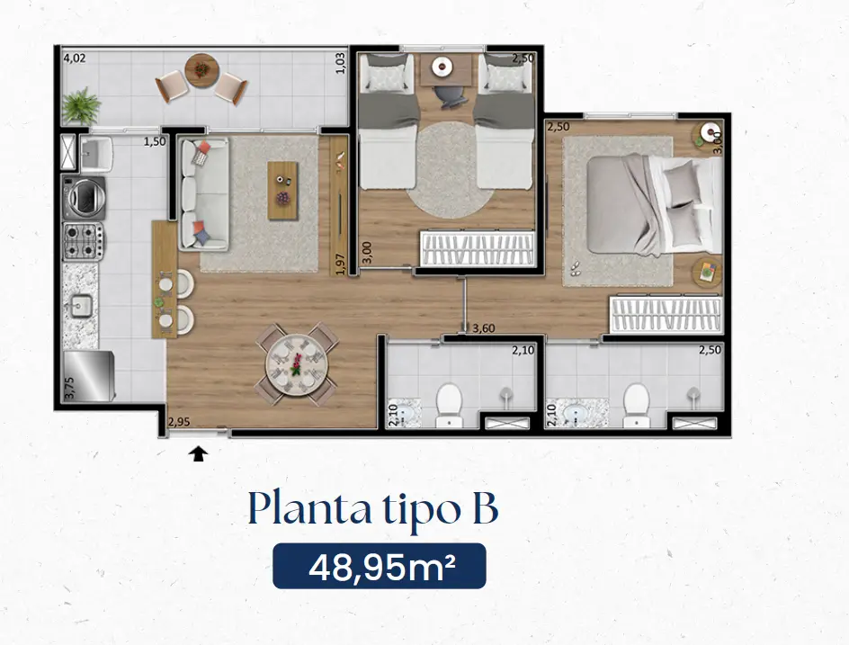 As unidades foram projetadas com plantas inteligentes de 48 m² a 49 m², dispondo de: