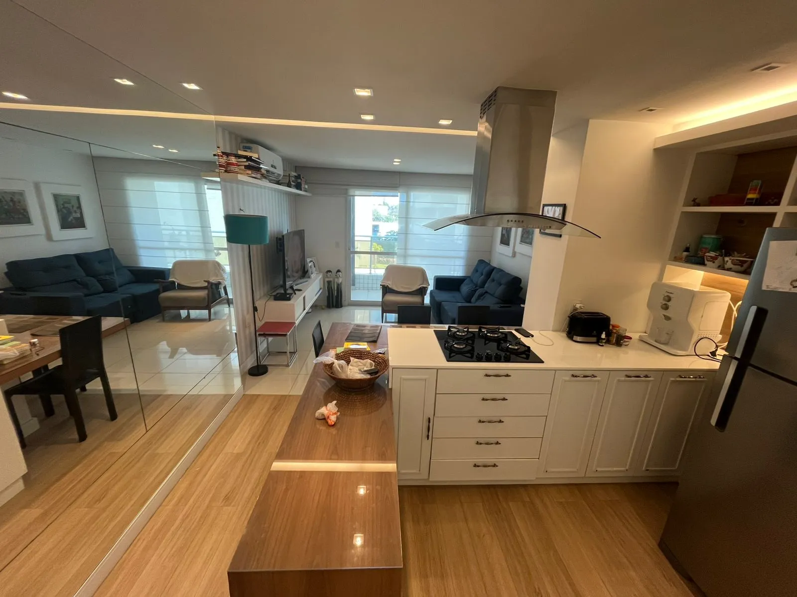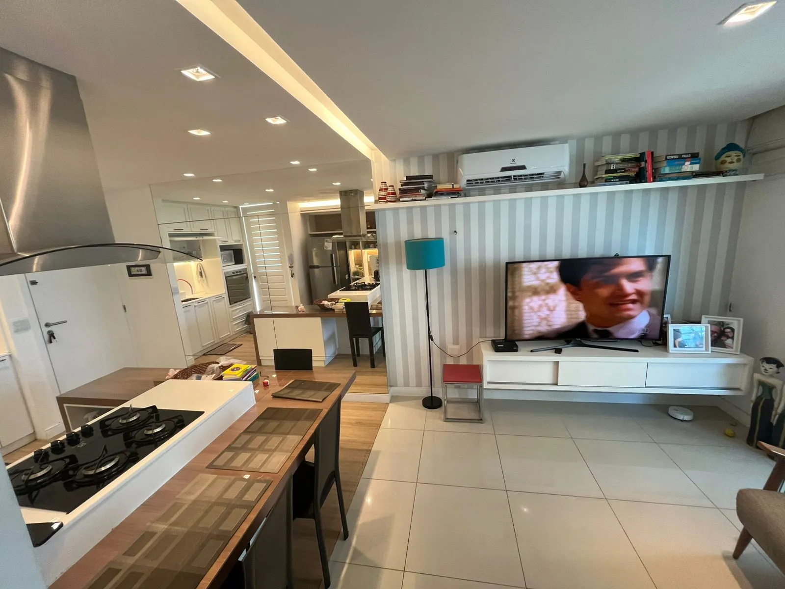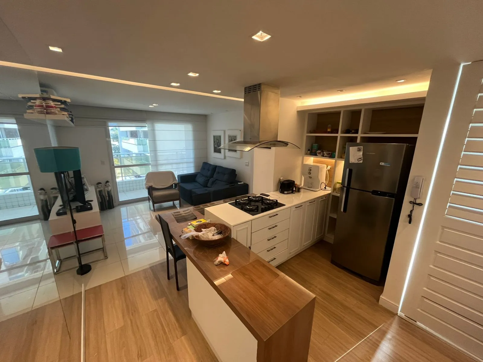 Social: Sala ampla em dois ambientes integrada à varanda e cozinha americana com móveis projetados.