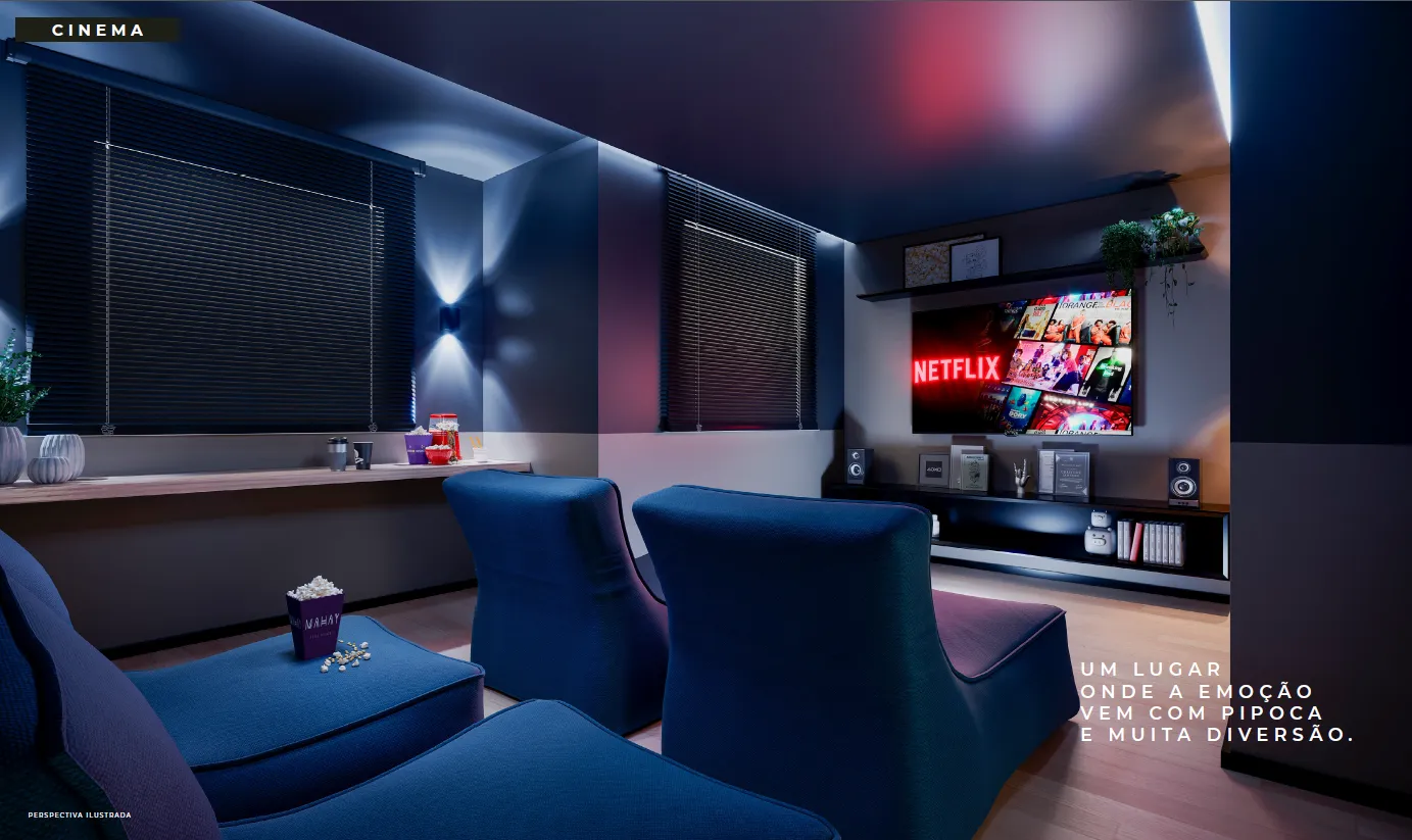 Diversão para Todos: As crianças têm diversão garantida na Brinquedoteca, no Playground e no Salão de Festas Infantil. Para os jovens e adultos, o empreendimento oferece Salão de Jogos (Teen e Adulto), Cinema e Quadra Esportiva.