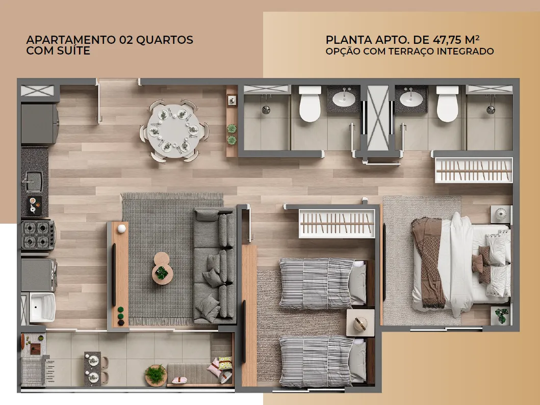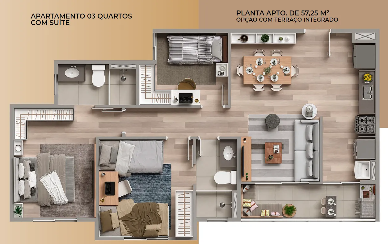 Com opções de 2 e 3 quartos (com suíte), os apartamentos contam com varanda gourmet e plantas inteligentes de 47,75 m² a 57,25 m², garantindo luz, liberdade e o conforto que sua família merece.