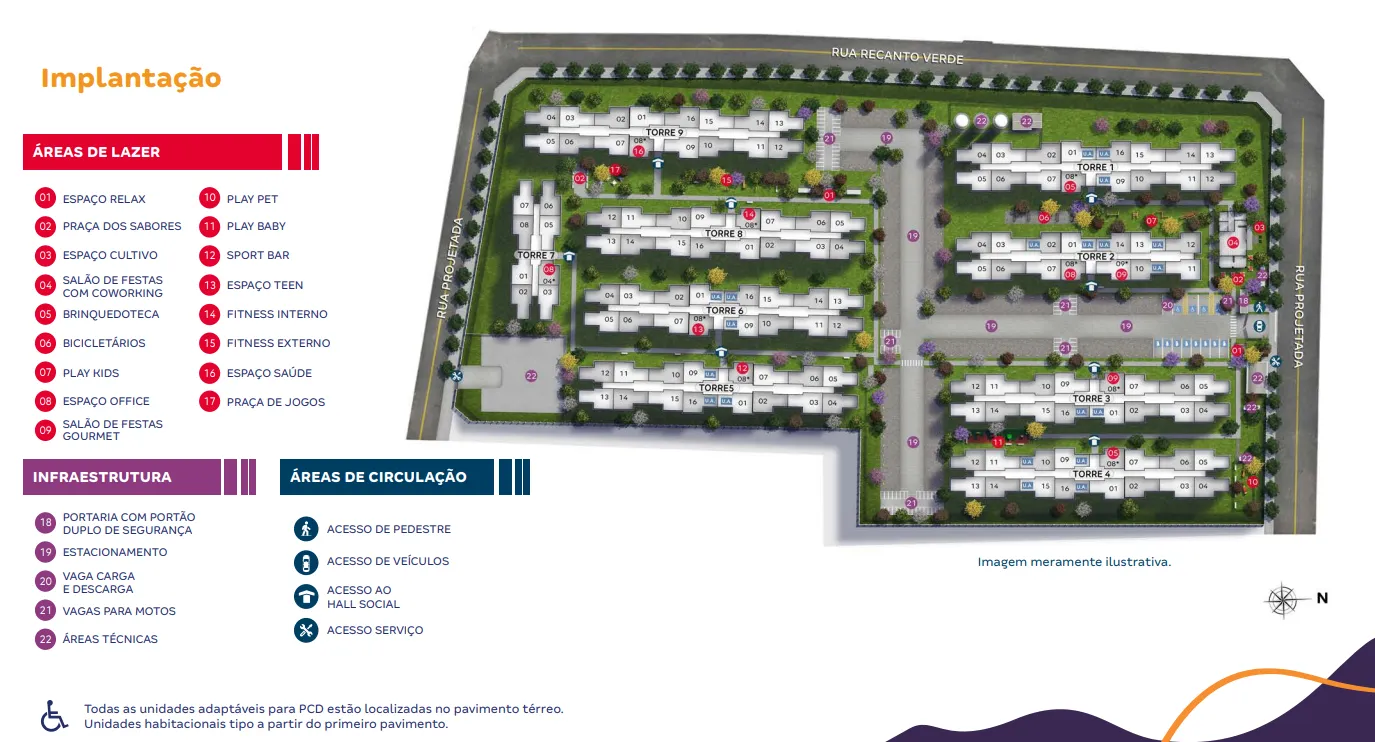 Os apartamentos possuem plantas inteligentes de 2 quartos (38,40 m² a 38,66 m²), com sala de estar e jantar integradas, cozinha funcional e opções com vaga de garagem. A infraestrutura de lazer é um destaque à parte: