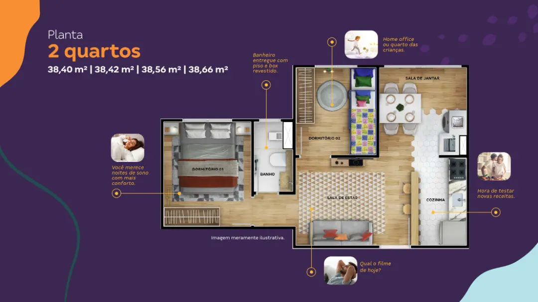 Área privativa: 38,40 m2 | 38,42 m2 | 38,56 m2 | 38,66 m2