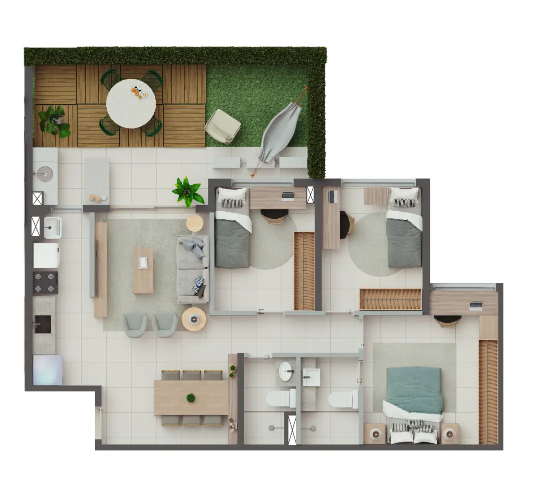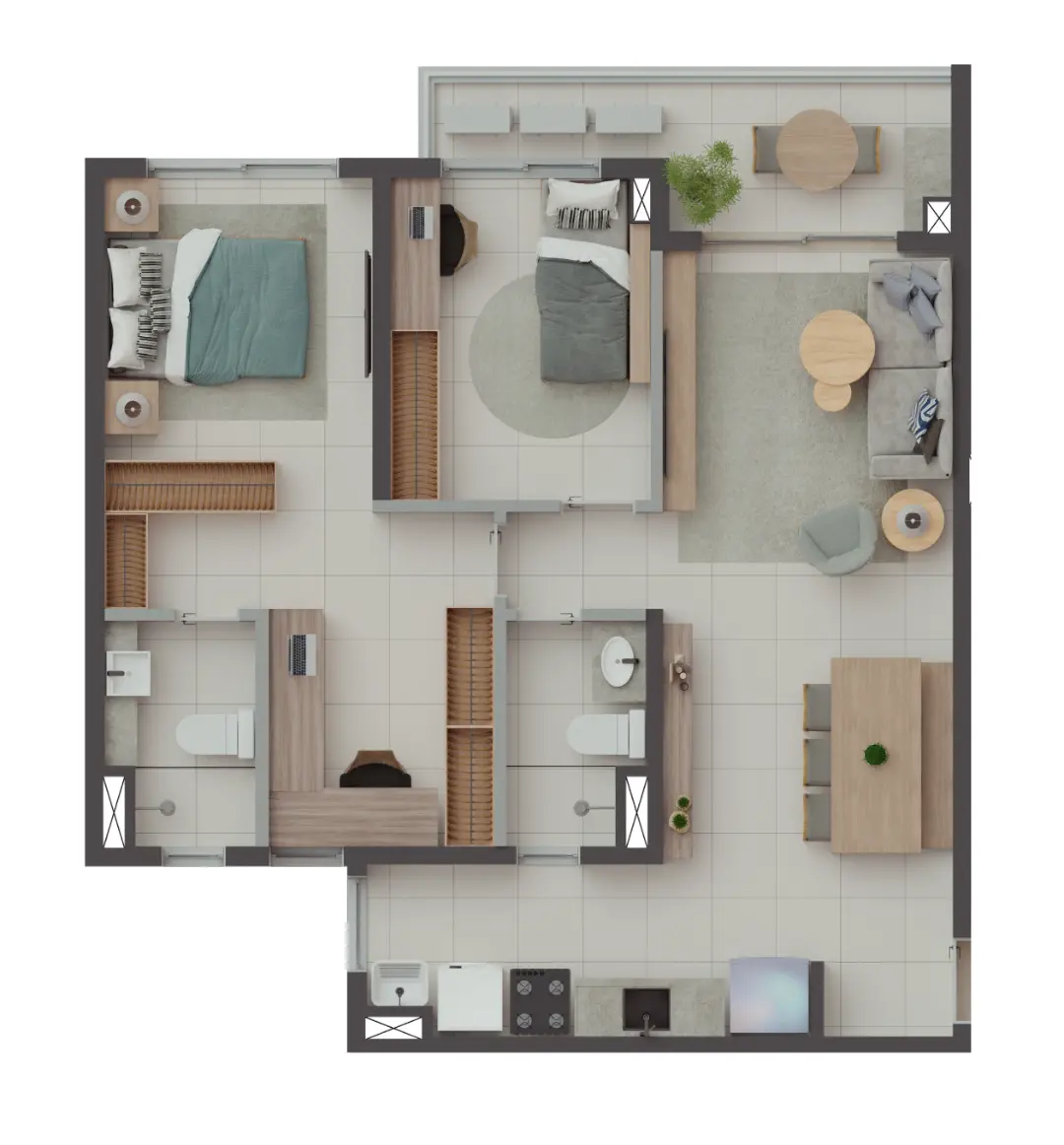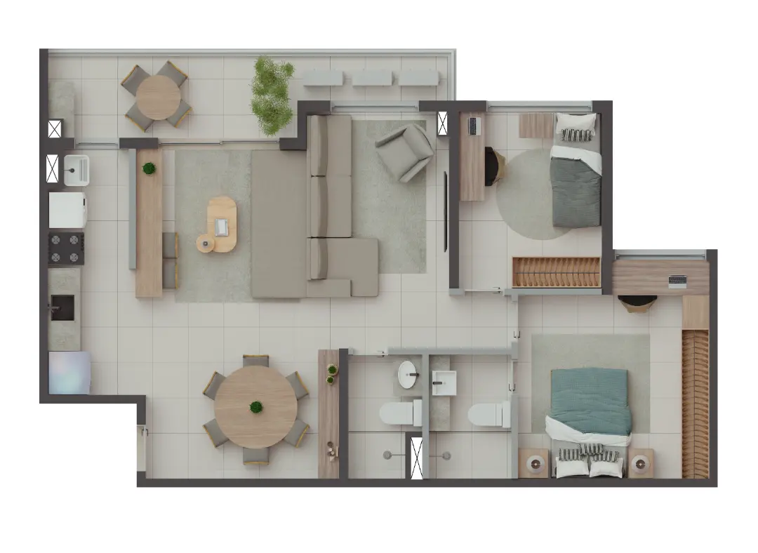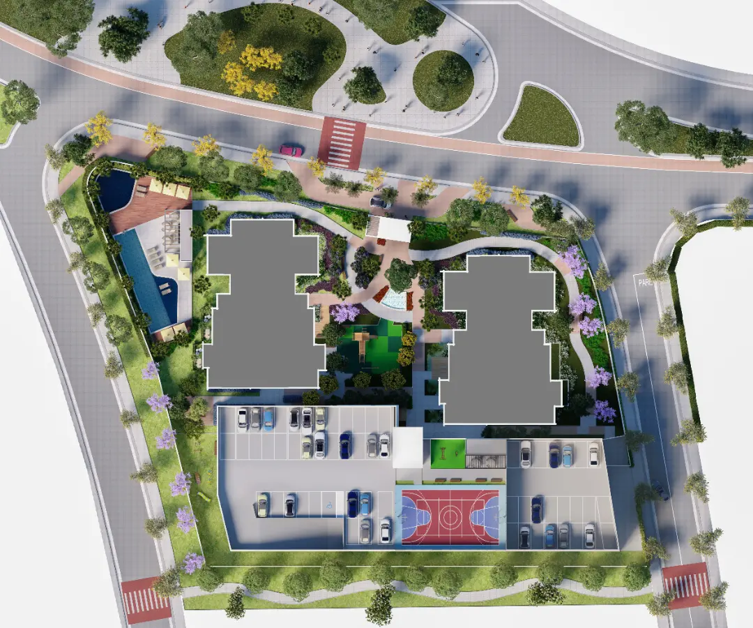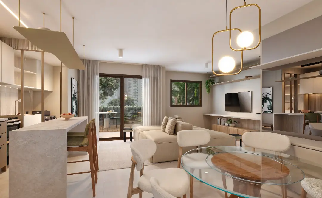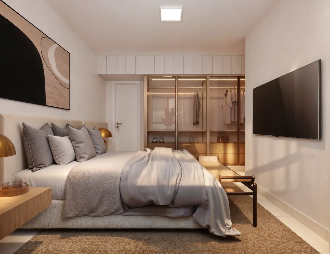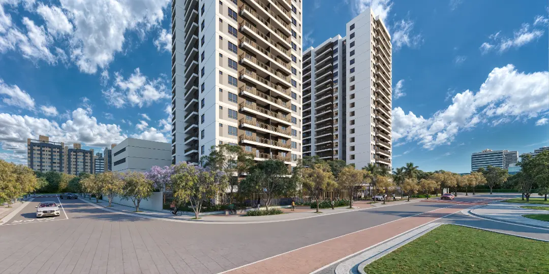 Os apartamentos foram desenhados para otimizar o espaço e proporcionar o máximo de conforto térmico e acústico. As metragens variam para atender diferentes perfis familiares: