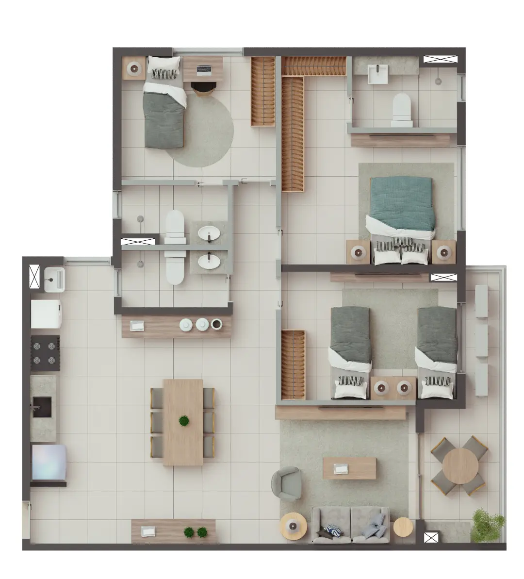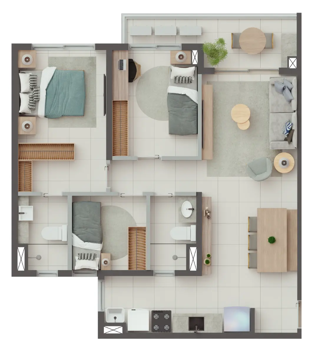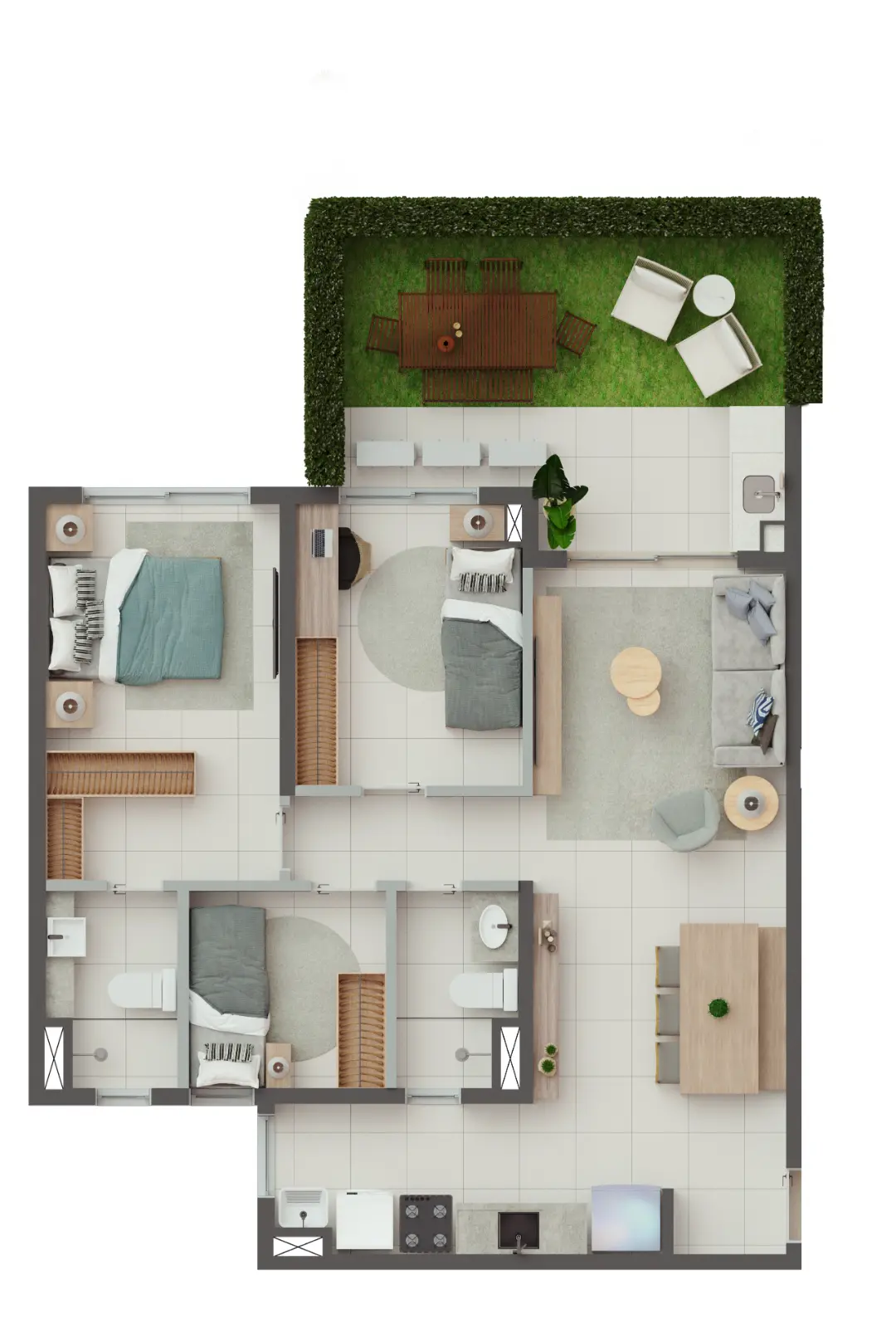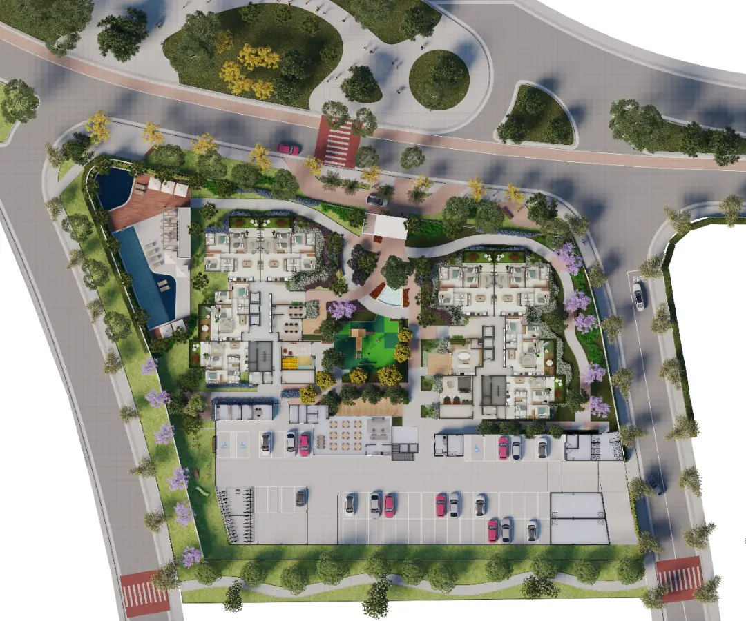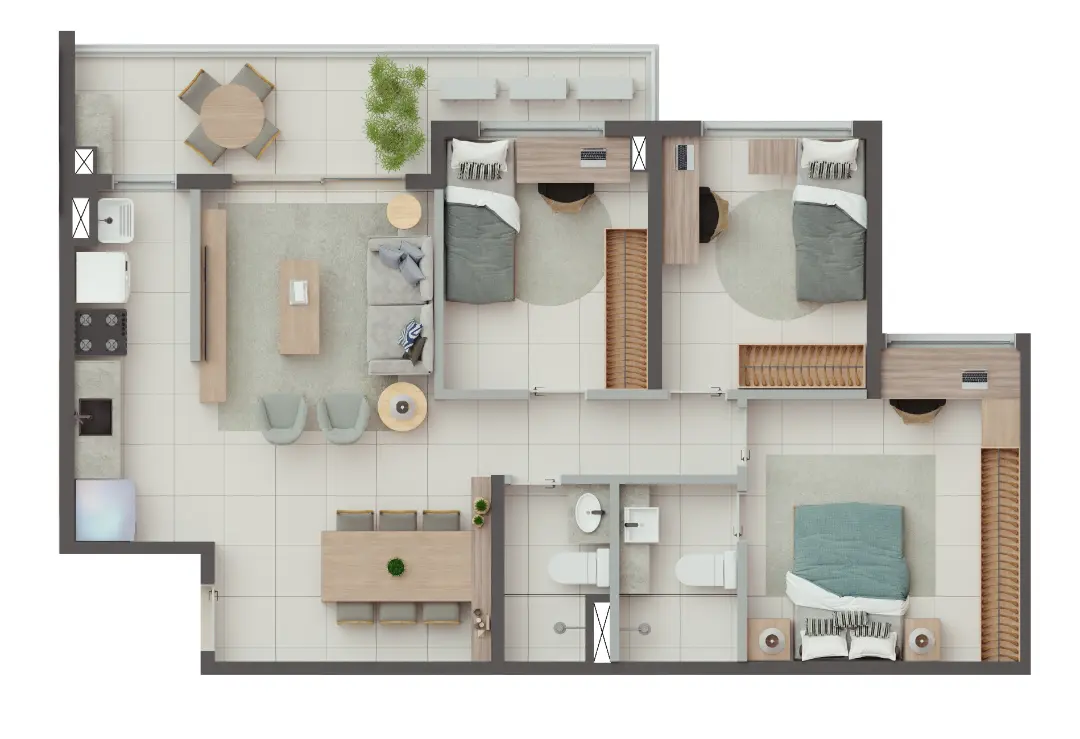 Os apartamentos foram desenhados para otimizar o espaço e proporcionar o máximo de conforto térmico e acústico. As metragens variam para atender diferentes perfis familiares: