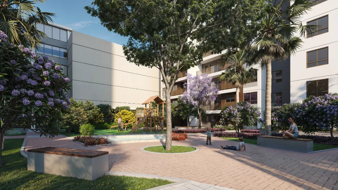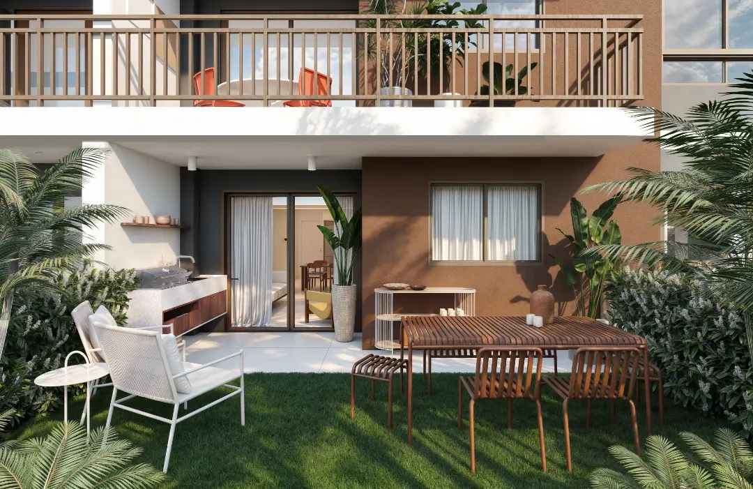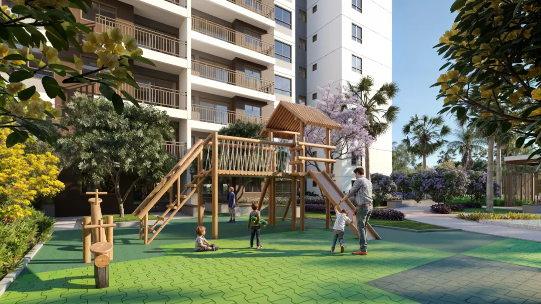 Áreas de convivência ao ar livre e paisagismo integrado.