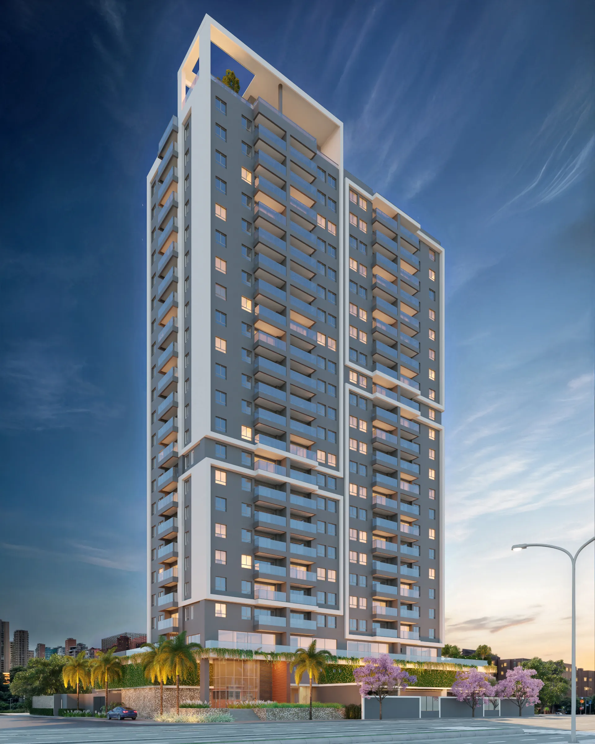 Pavimentos: 25 andares (Subsolo, Térreo, Sobressolo, Pavimento Lazer, 20 andares tipo e Cobertura/Sky View).