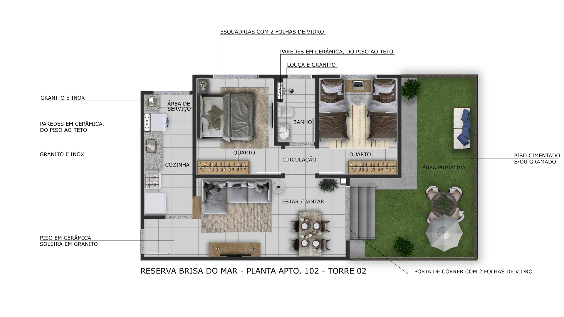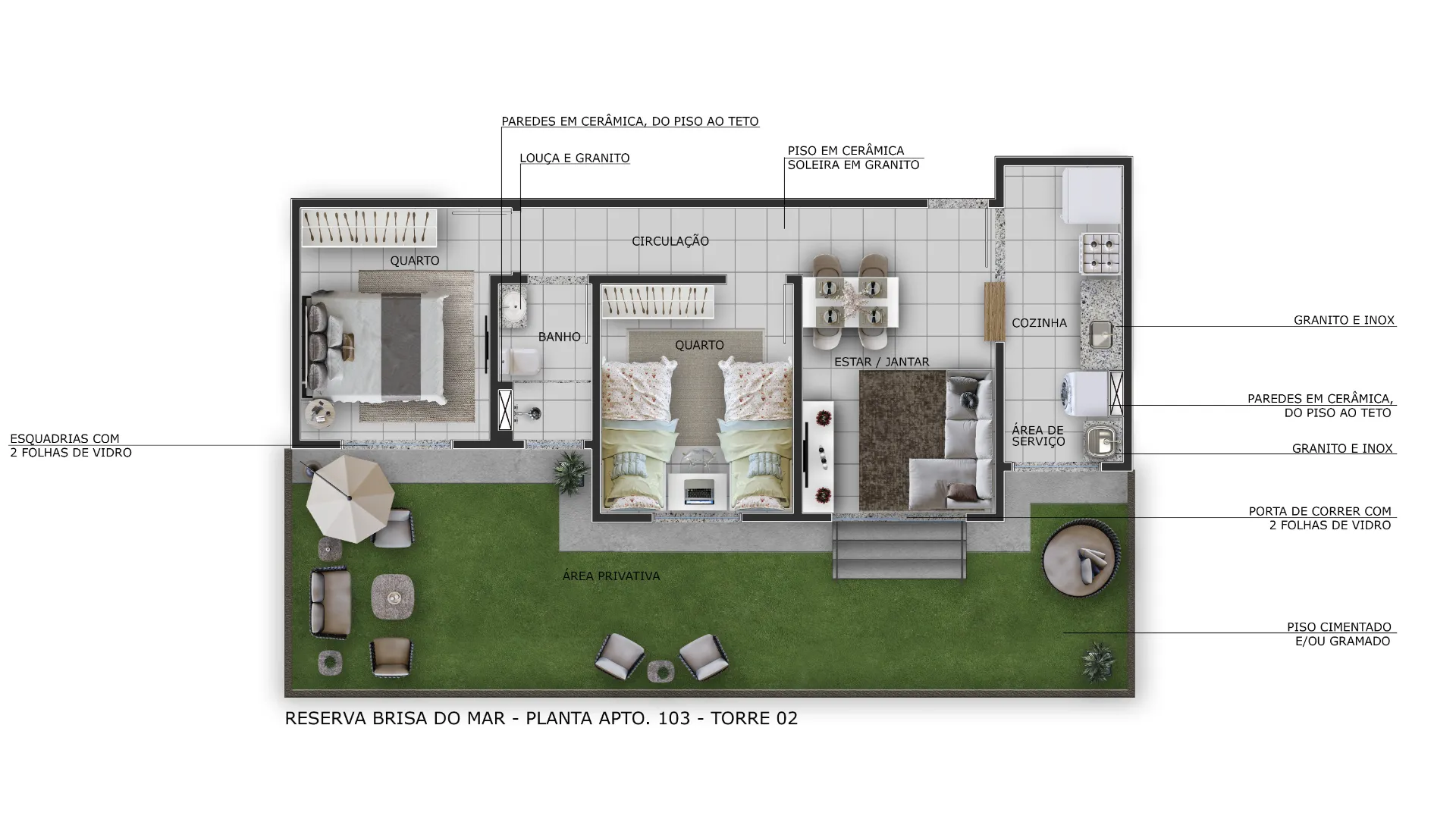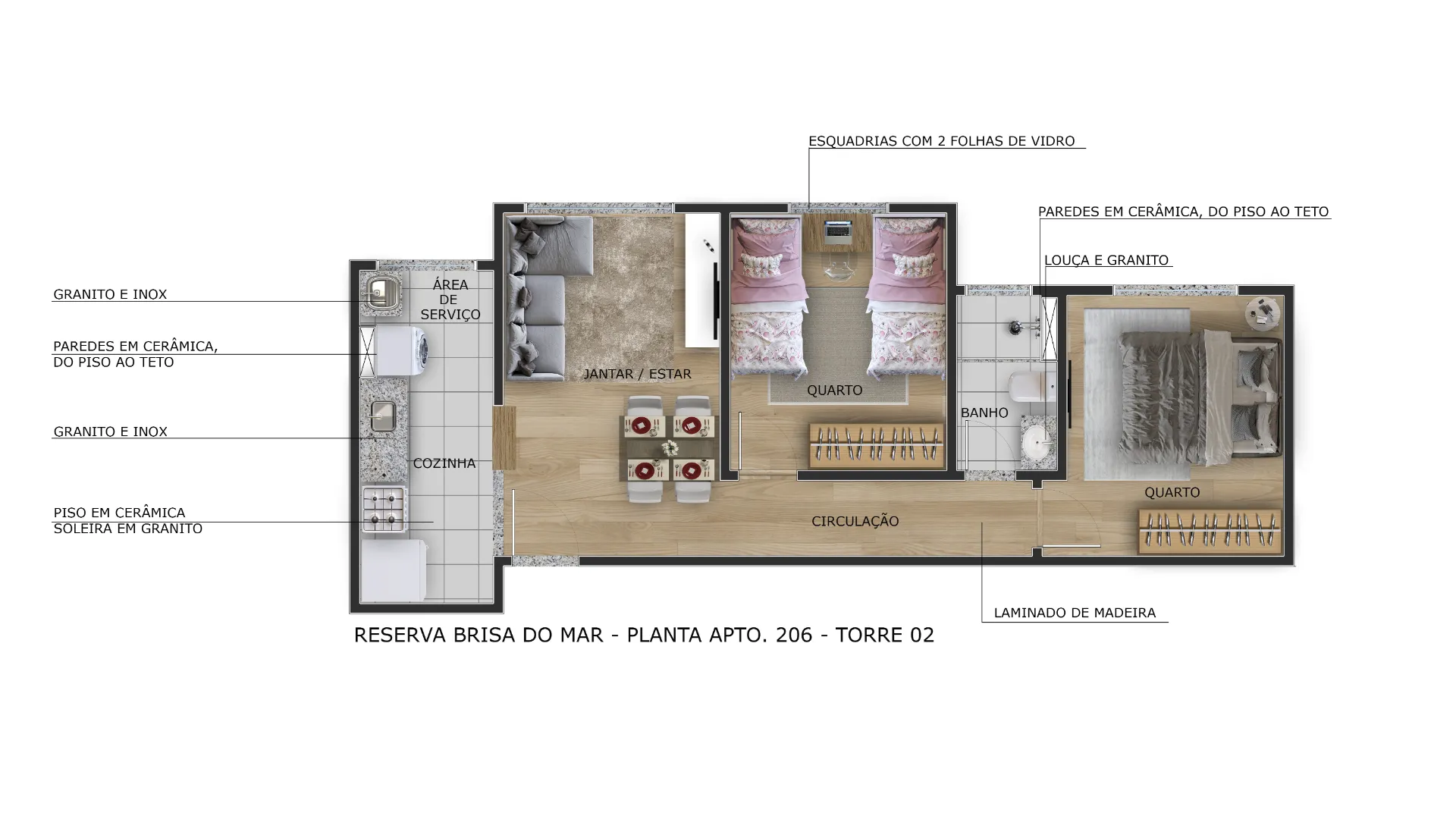 Acabamento Superior: Piso laminado na sala e nos quartos, garantindo elegância e conforto térmico.