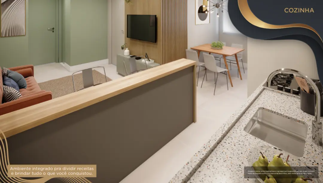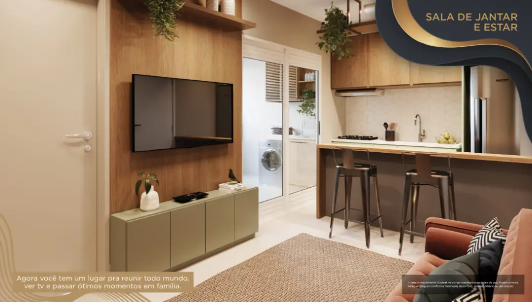 Ambientes: Sala de estar e jantar integradas, cozinha americana e área de serviço.