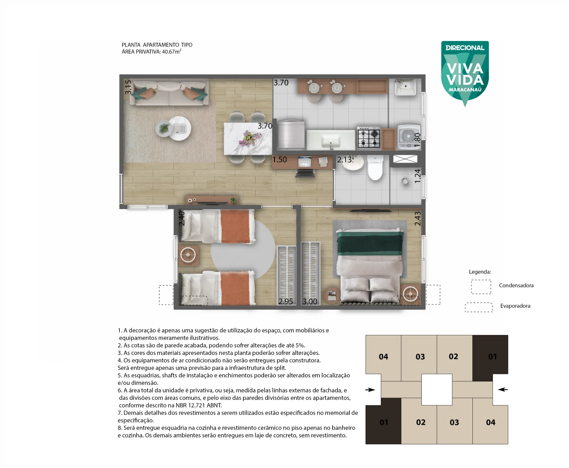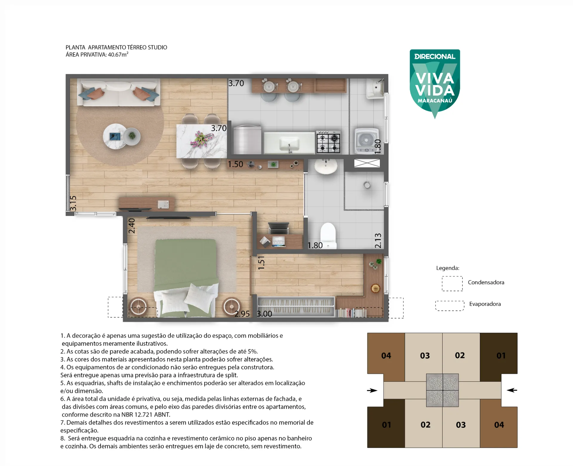Área privativa: 40,67m2, nas plantas com garden + 6,42m2