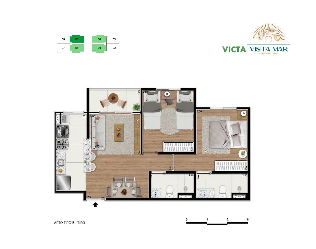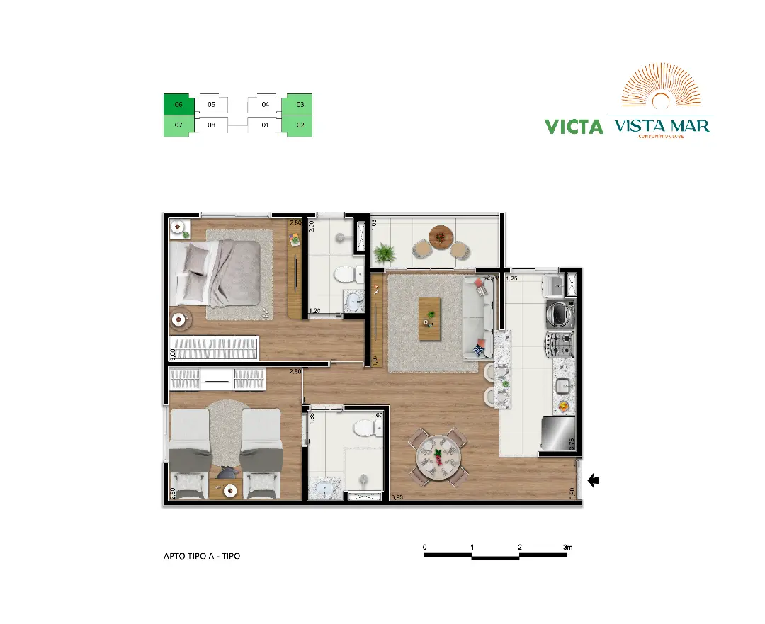 Configuração: Apartamentos com 2 suítes (sendo 1 reversível em alguns modelos).