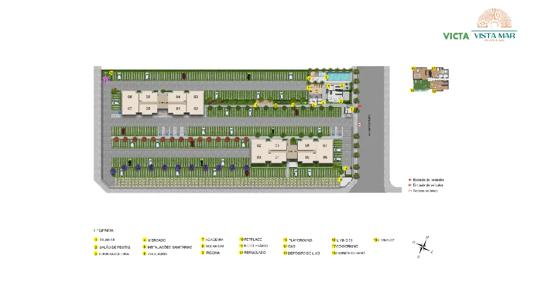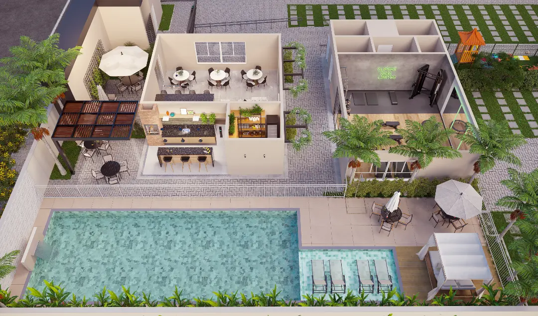 Viver no Vista Mar é ter um clube particular à disposição. O condomínio entrega uma área de lazer completa e equipada, pensada para todas as idades:Complexo Aquático: Piscinas adulto e infantil para os dias de sol.