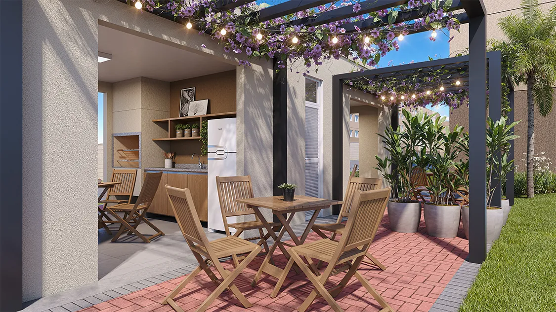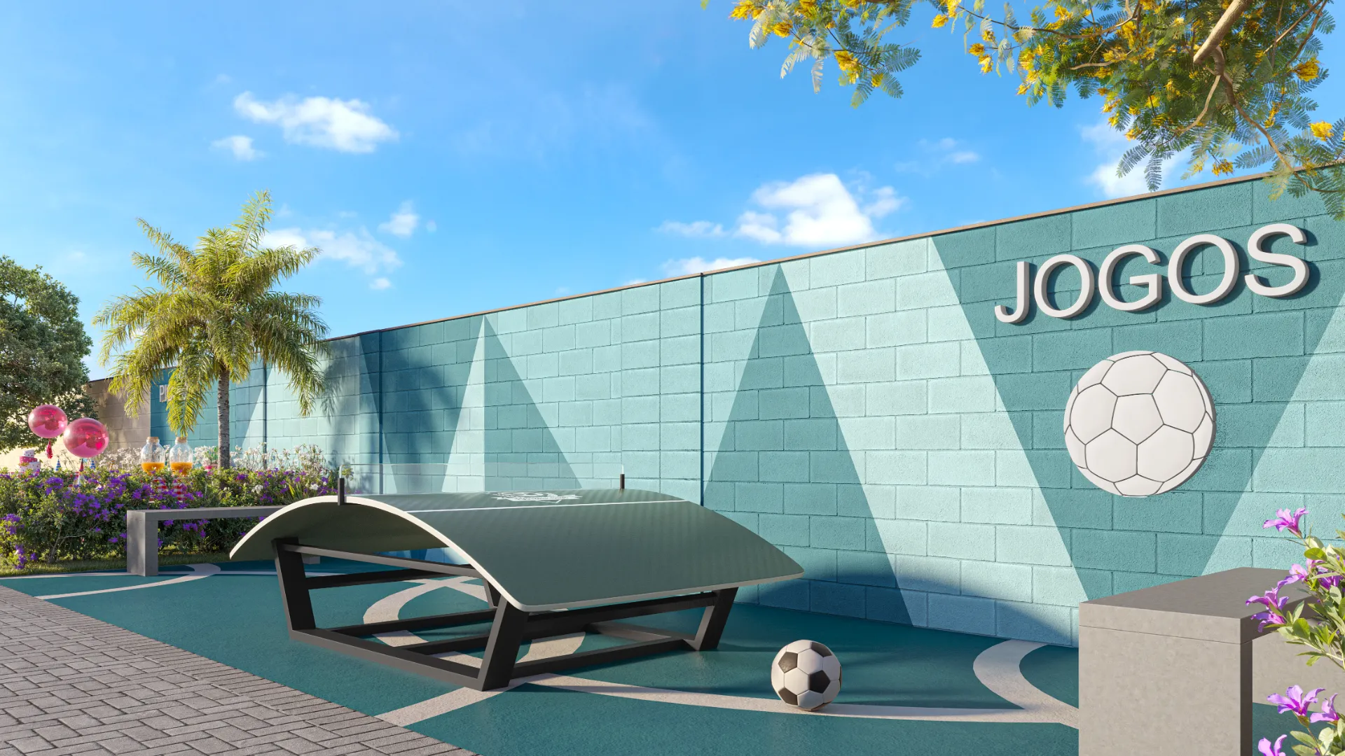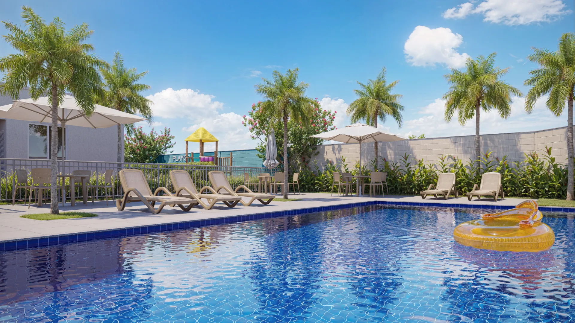 Lazer Completo: Piscina adulto, solarium, churrasqueiras, salão de festas com apoio, playground e praça de jogos.