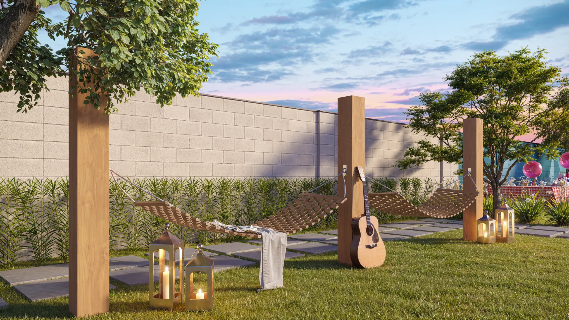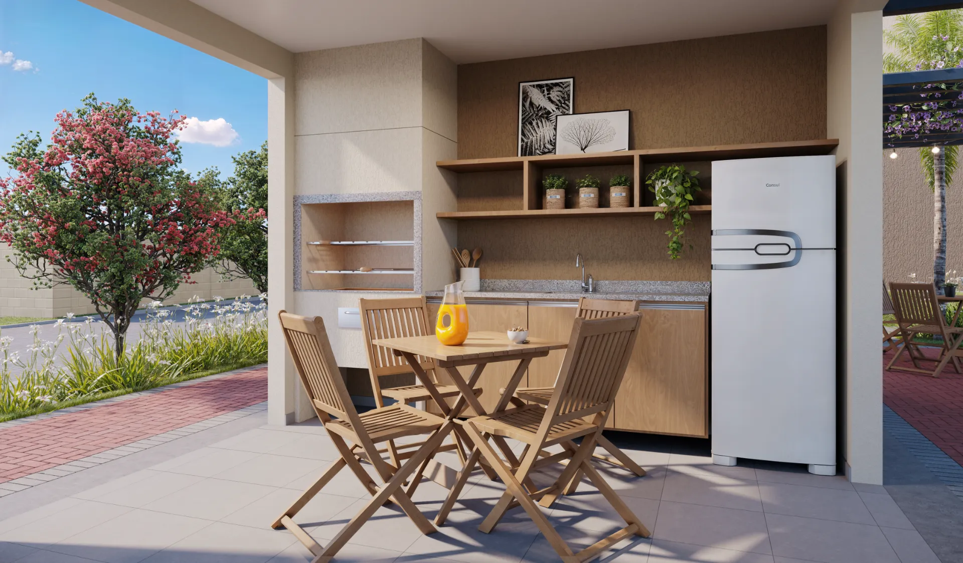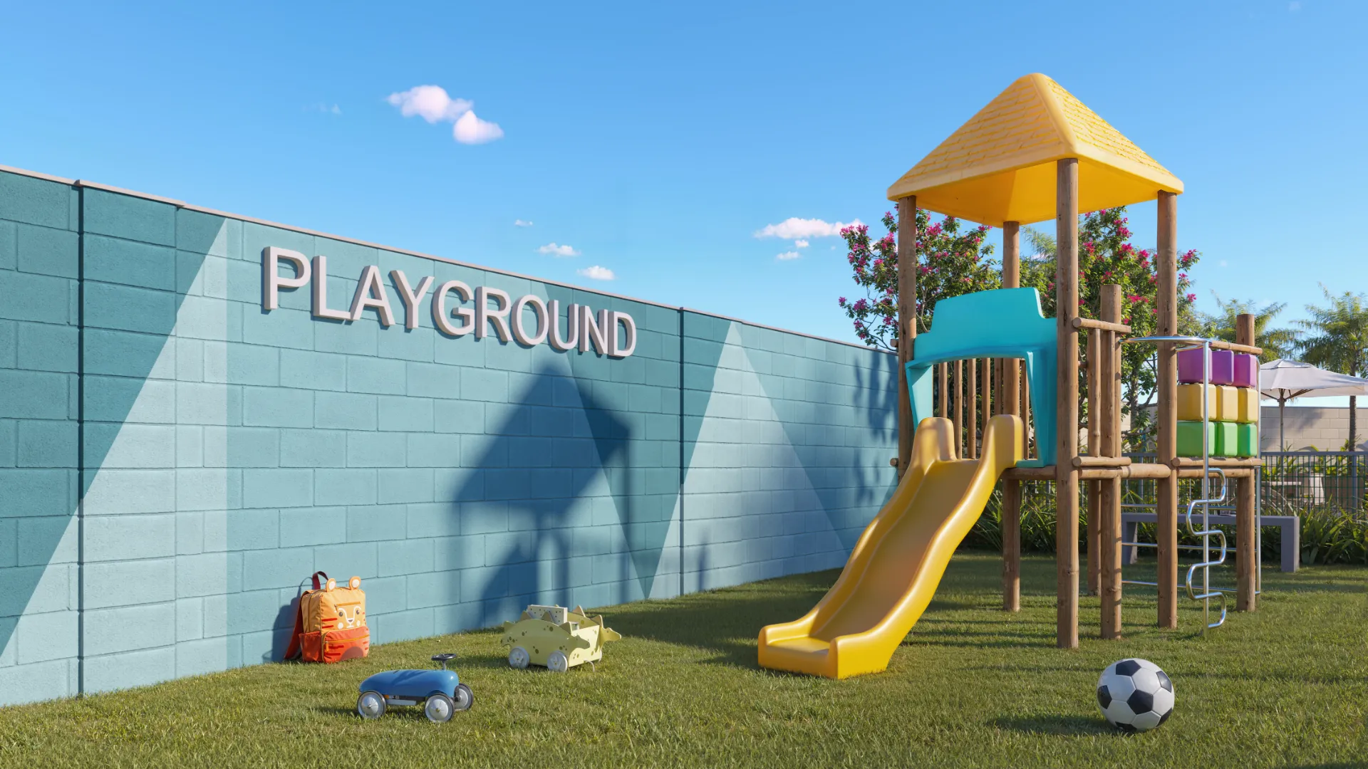 Lazer Completo: Piscina adulto, solarium, churrasqueiras, salão de festas com apoio, playground e praça de jogos.