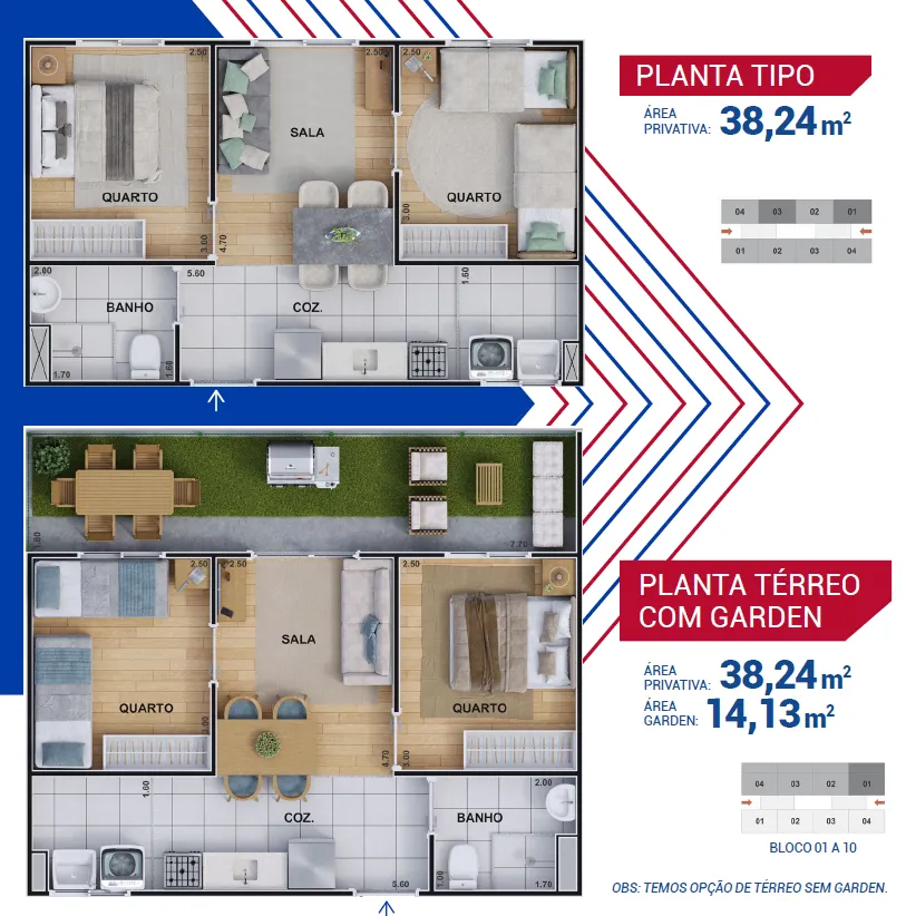 O condomínio é composto por 18 blocos com 5 pavimentos cada (térreo + 4), totalizando 360 unidades residenciais. Os apartamentos possuem planta tipo de 38,24 m², com opções de unidades no térreo que incluem garden privativo de 14,13 m².